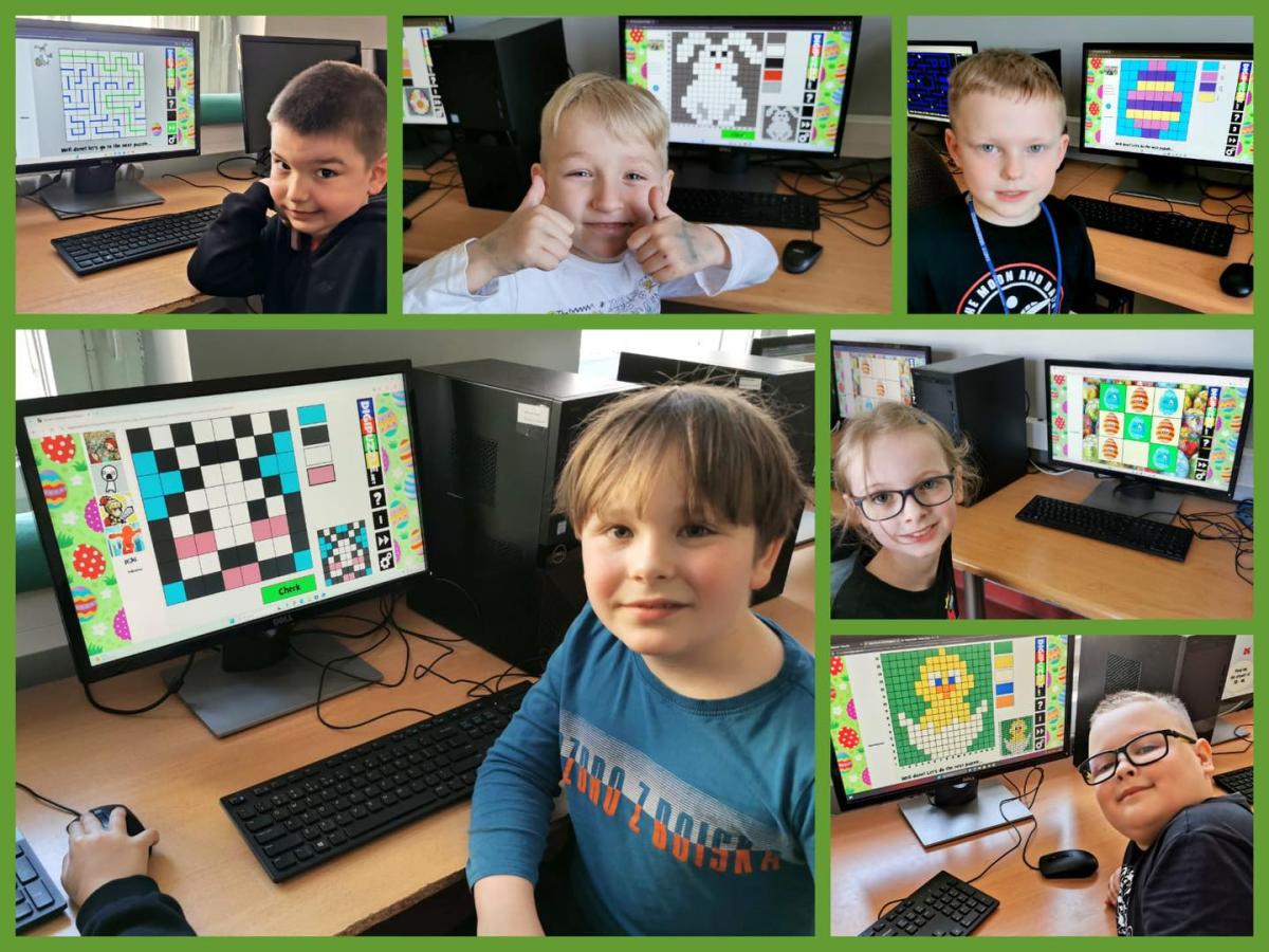 Na zajęciach komputerowych pracowali na stronie Digipuzzle, gdzie czekało na nich wiele wielkanocnych aktywności: kodowanki, puzzle, kolorowanki i inne interaktywne zabawy.